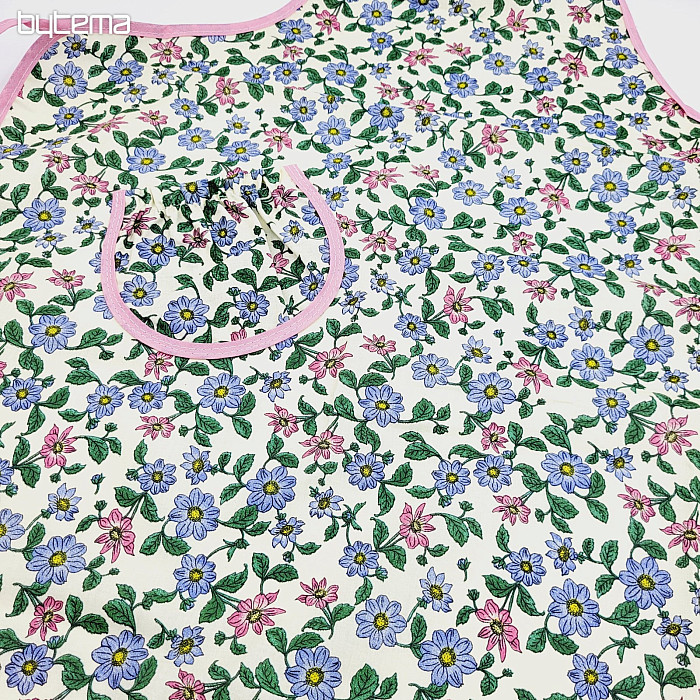 Women's apron full of flowers, with pink trim and a practical pocket.