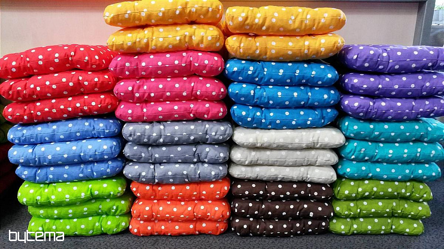 NEO chair seats, BYTEMA brand, in a modern polka dot pattern in pastel colors. The seats are filled with foam crumb, the cover is decorated with NEO fabric