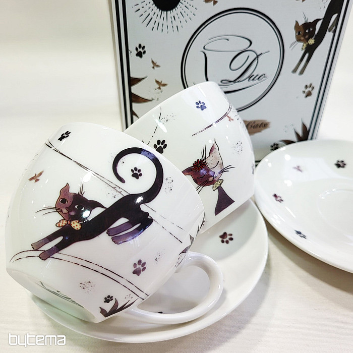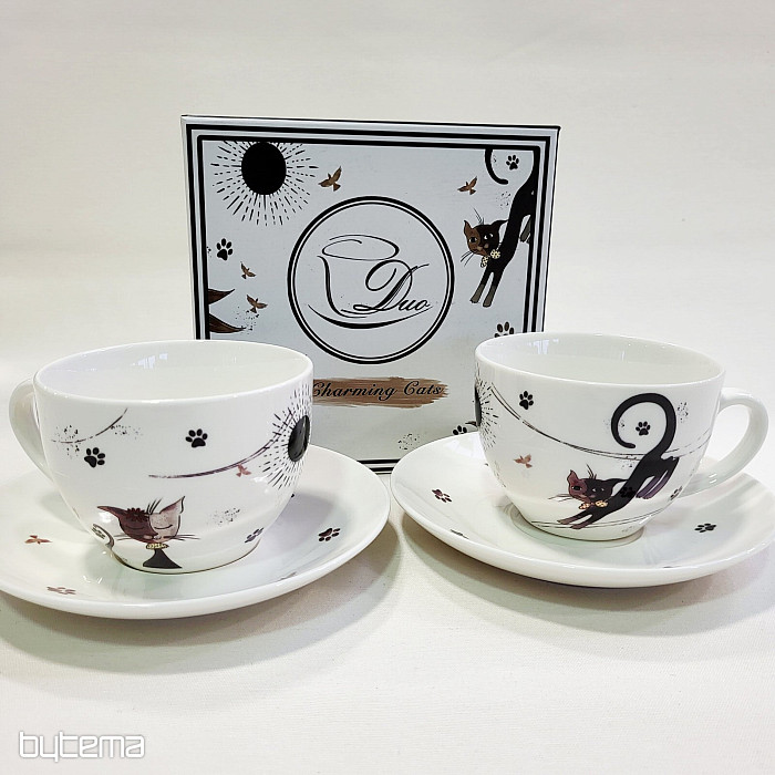 Two 280 ml cups are made of porcelain, as are two saucers. The whole set is packed in a printed paper box.