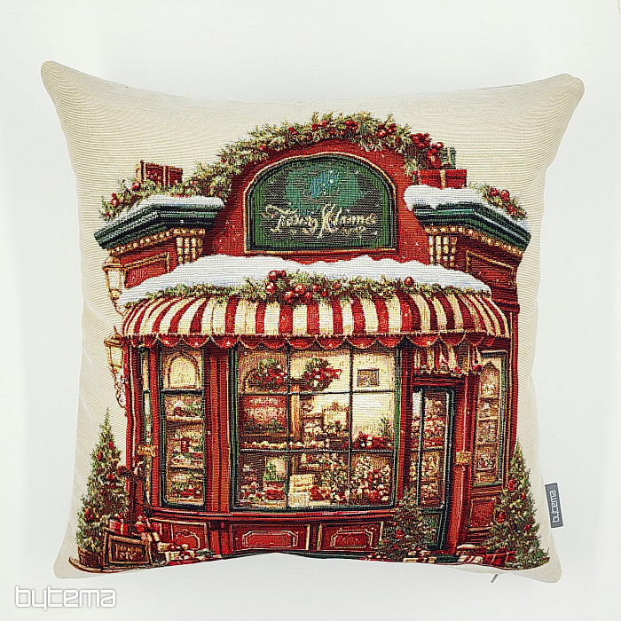 Tapestry cover with a motif of a Christmas window display on a busy street. A beautiful Christmas accessory for your home.