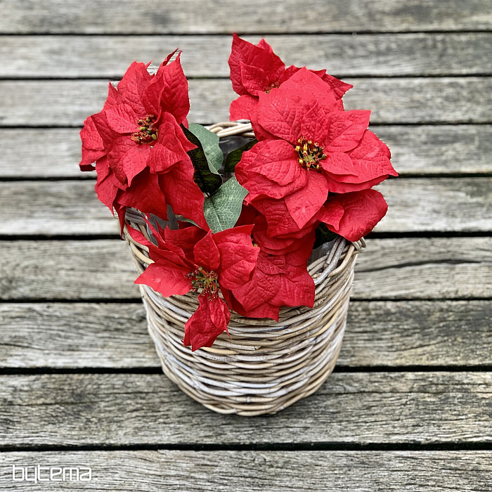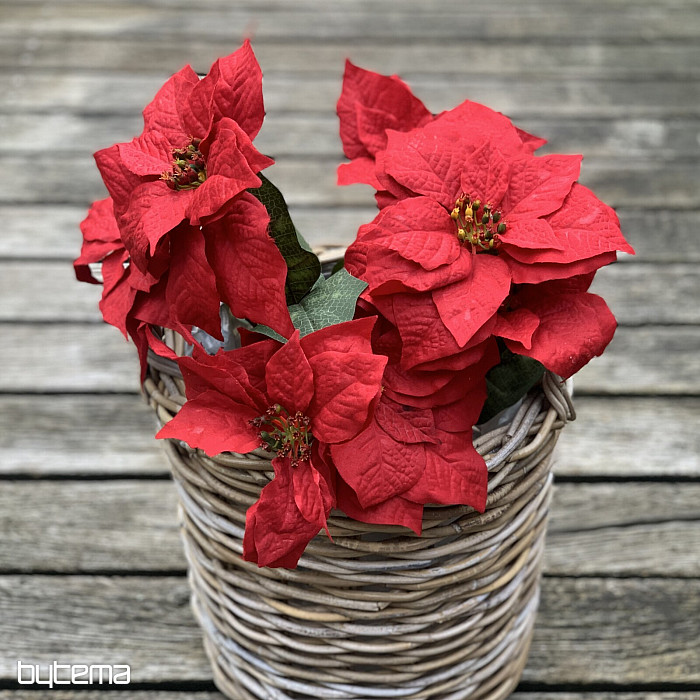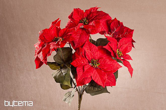 A large bouquet of red flowers in a successful design. There are seven flowers and many leaves in a rich bunch. The flower looks very natural and thanks to its nice appearance you will get an impressive decoration during the Christmas season.