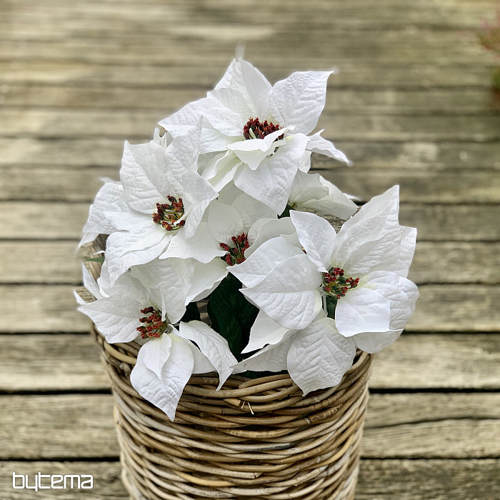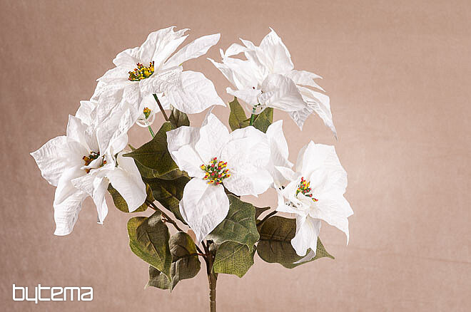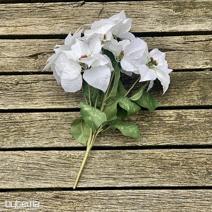 A large bouquet of red flowers in a successful design. There are seven flowers and many leaves in a rich bunch. The flower looks very natural and thanks to its nice appearance you will get an impressive decoration during the Christmas season.