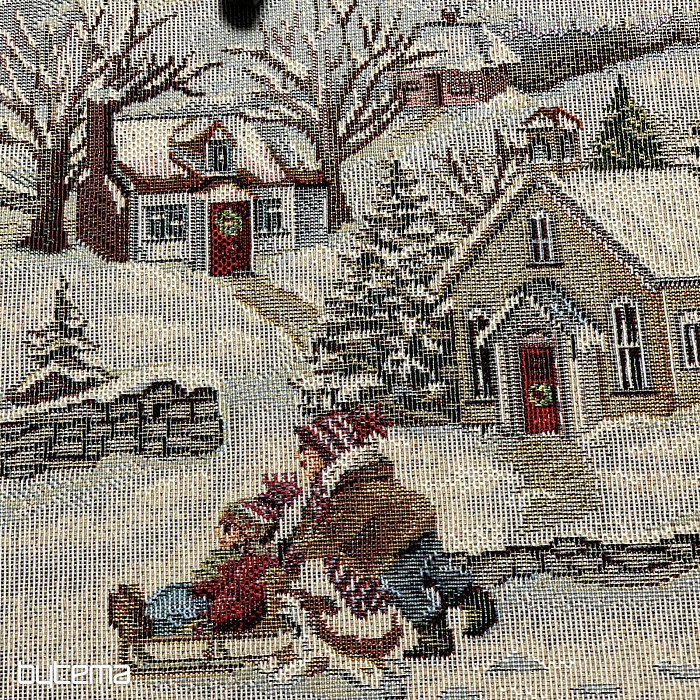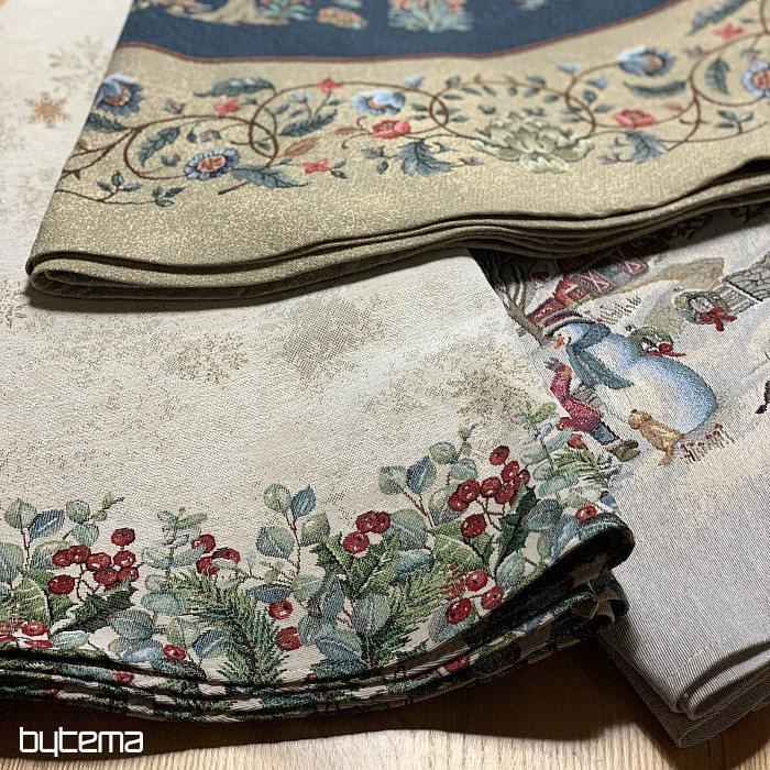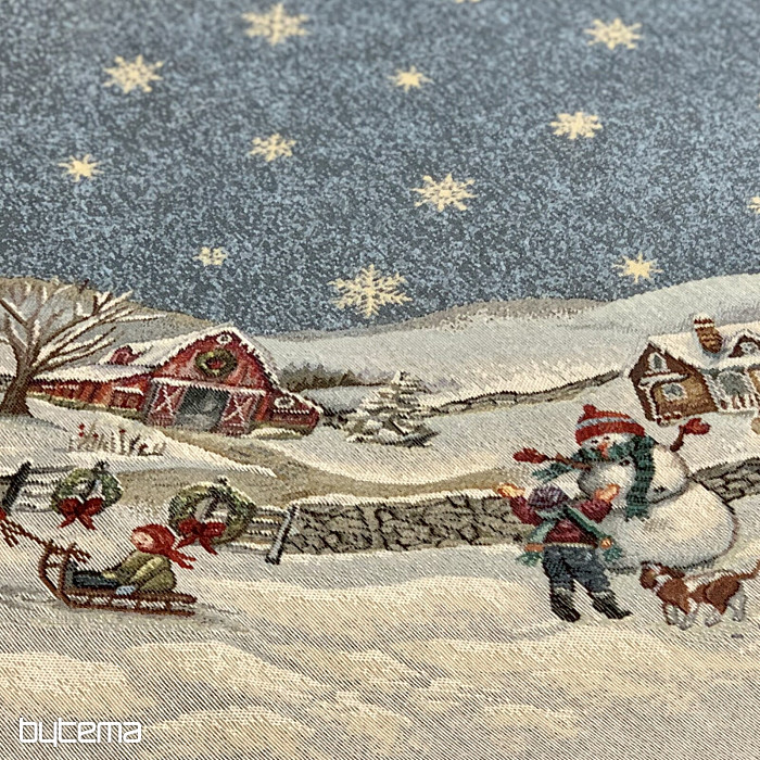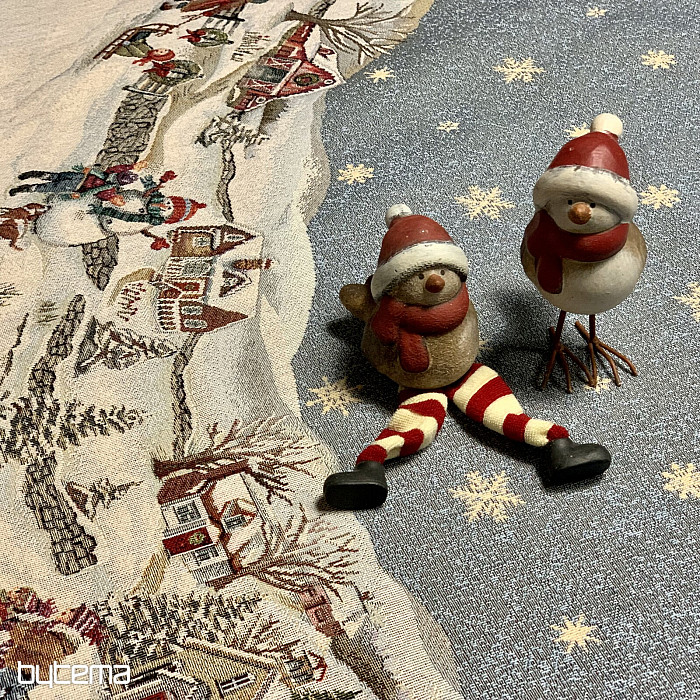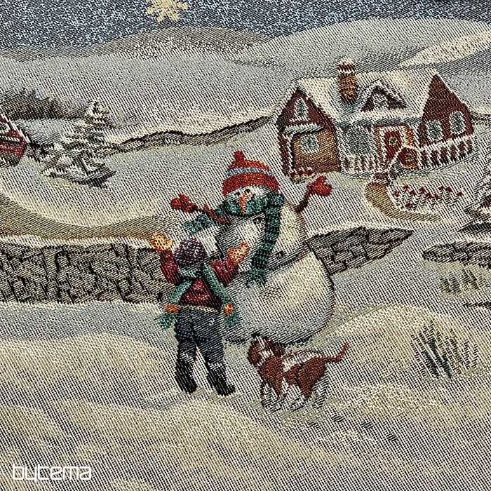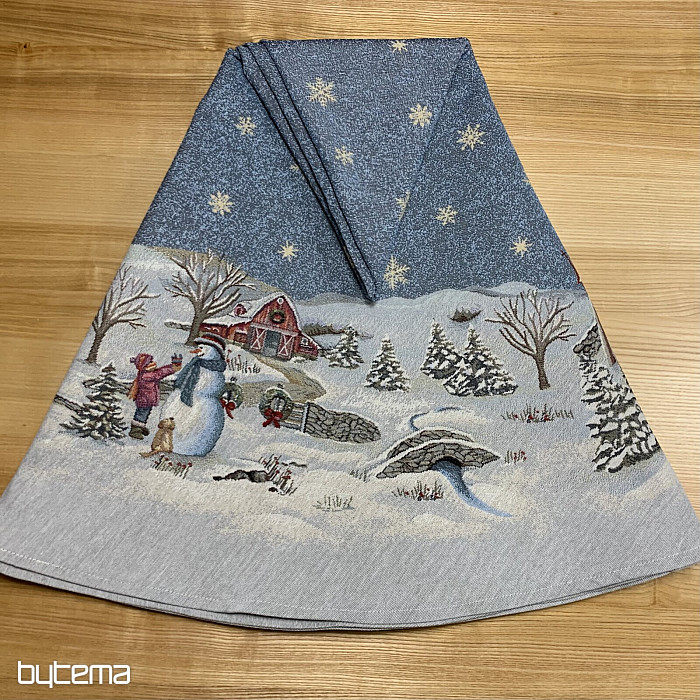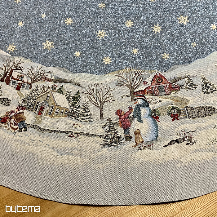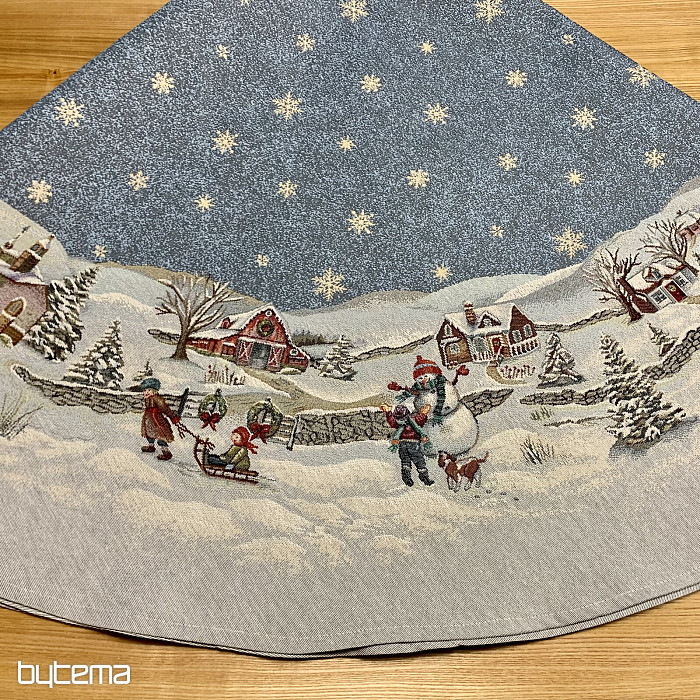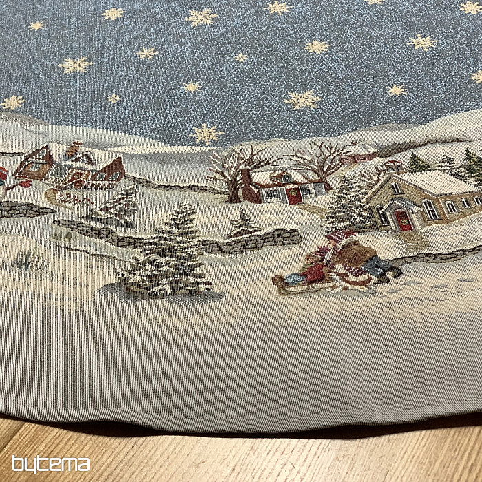 A beautiful tapestry round tablecloth with a perfect winter motif full of childish joy at Christmas.