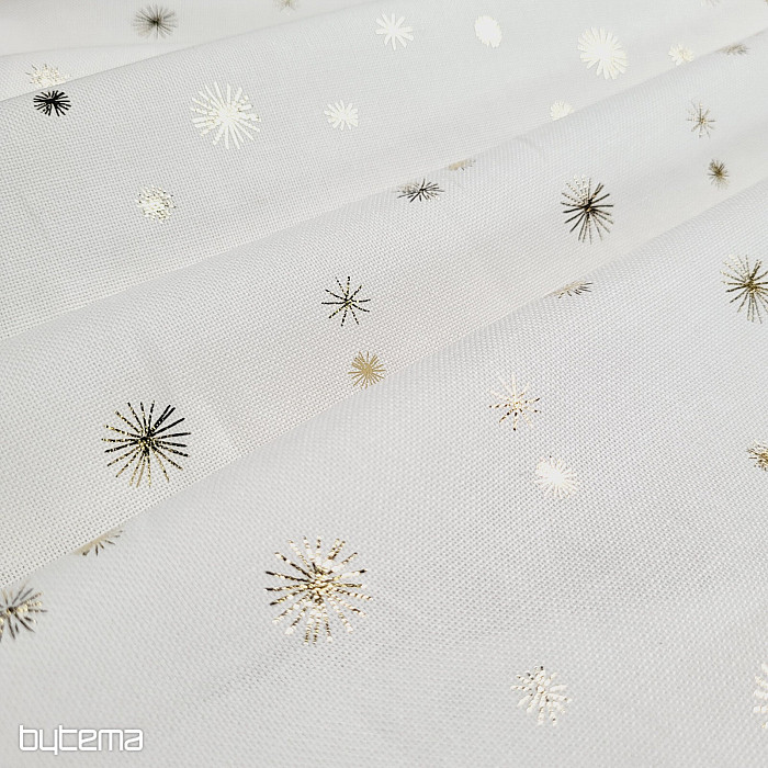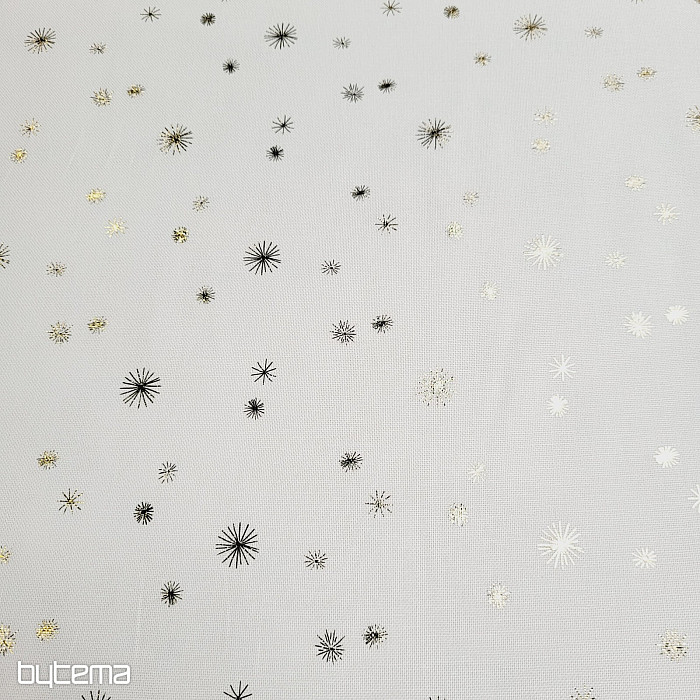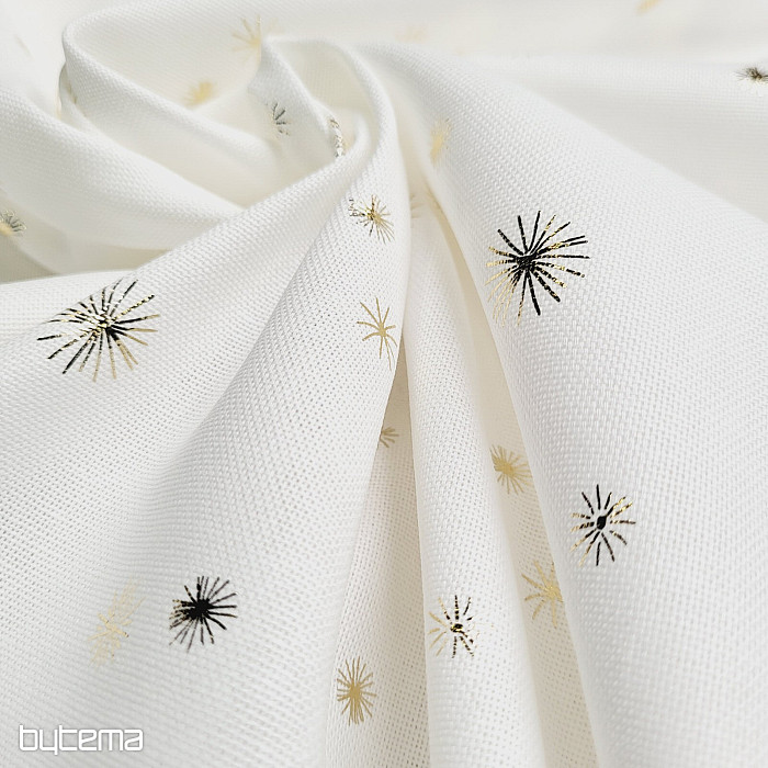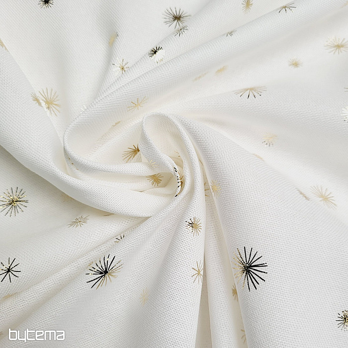Thicker cotton-CANVAS fabric with Christmas golden stars or flakes, is beautifully suited for tablecloths, placemats and or pillowcases.