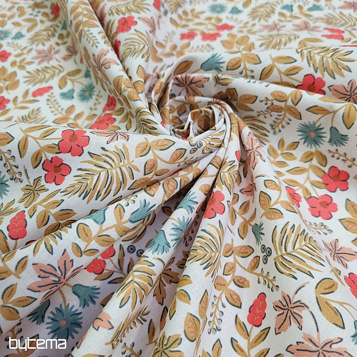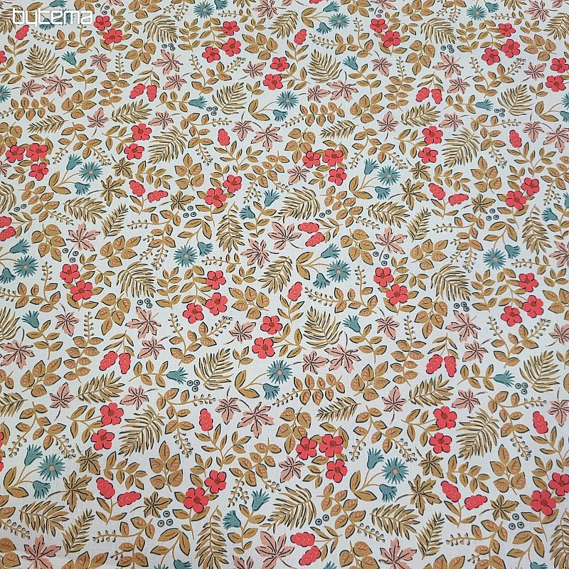 This cotton fabric with golden flowers and leaves will decorate your home. It fits beautifully in a country style, for curtains, tablecloths and pillowcases.
