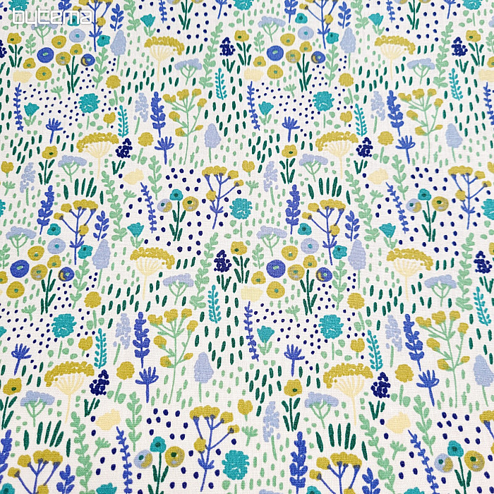 Cotton fabric with a blossoming meadow full of delicate lavender flowers.
