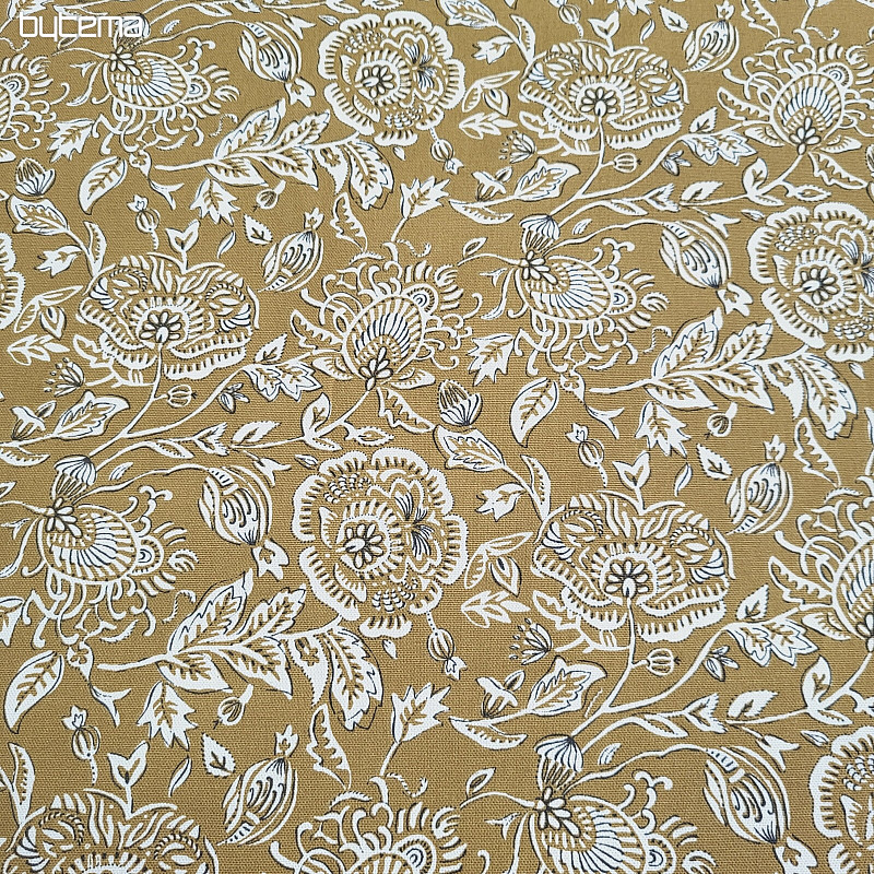 Fabric with a higher percentage of cotton, 220g, in the design of blossoming poppies on a honey background will stand out beautifully on a decorative curtain or tablecloth in your home.