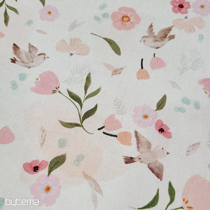 Cotton fabric with a spring motif of birds in flight and lots of blooming flowers. Soft spring design for country style.