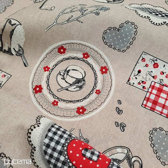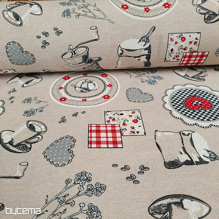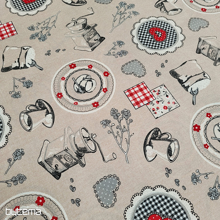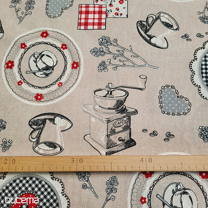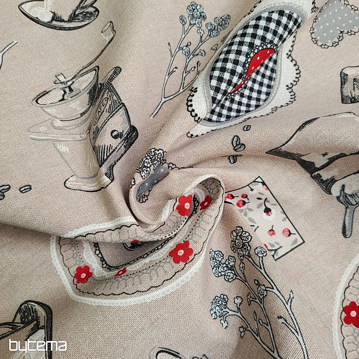 Decorative fabric with a design of coffee grinders and ready-made coffee will be a beautiful decoration for your kitchen.