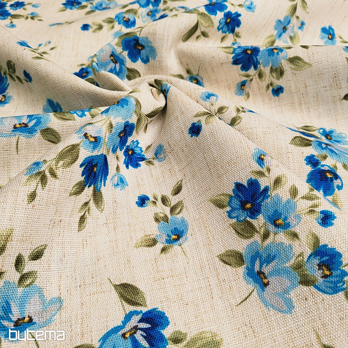 Decorative fabric with spring flowers in forget-me-not blue will decorate your kitchen and pergola.