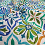 Decorative fabric with a large pattern of ornaments and flowers in various color variations.