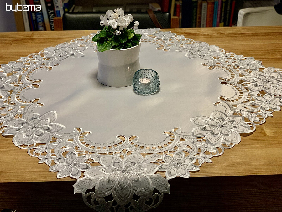 Embroidered Christmas tablecloths, scarves and placemats with a poinsettia motif.