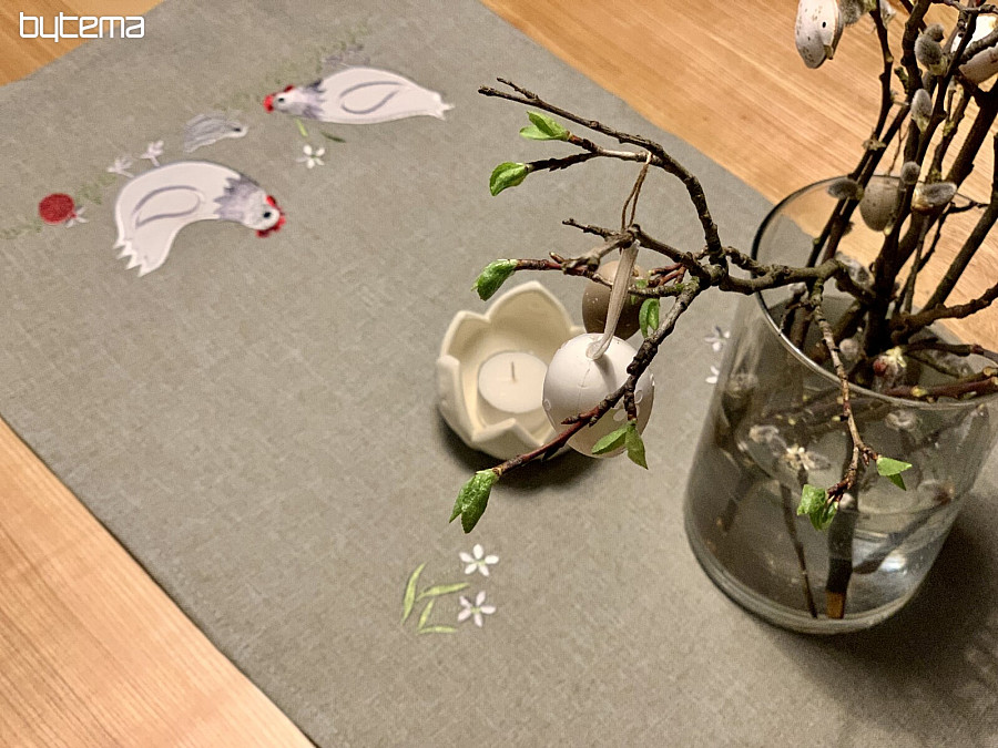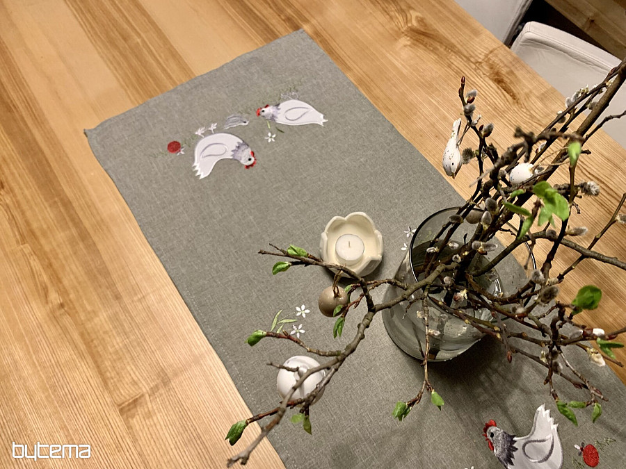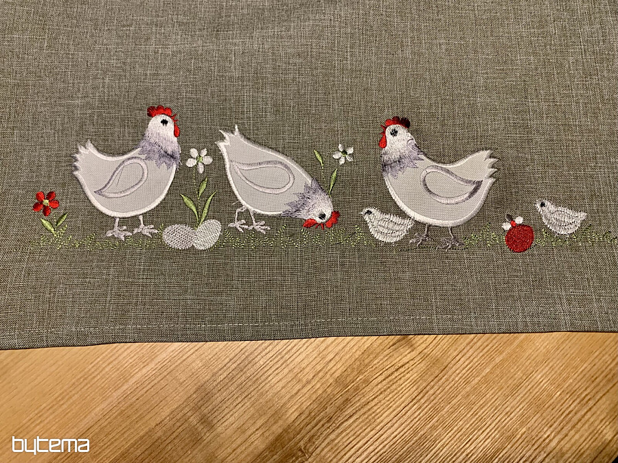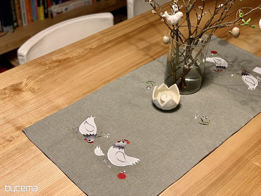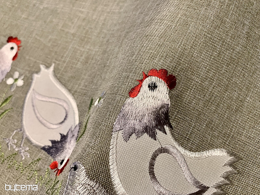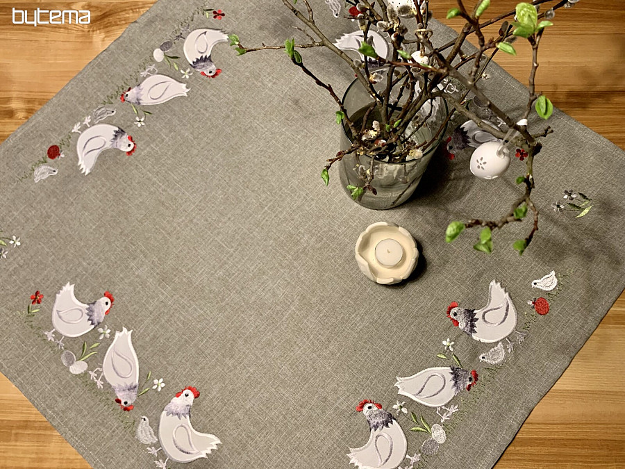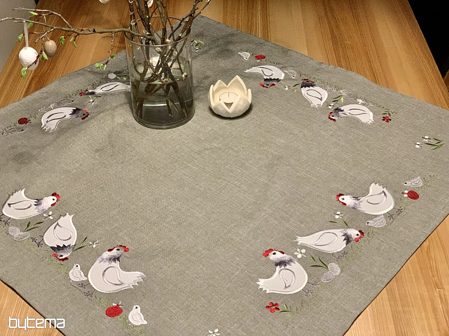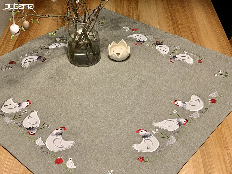 An embroidered Easter tablecloth and scarf with a decor of a white rooster and a hen with a chick will set your home in the mood for Easter time.