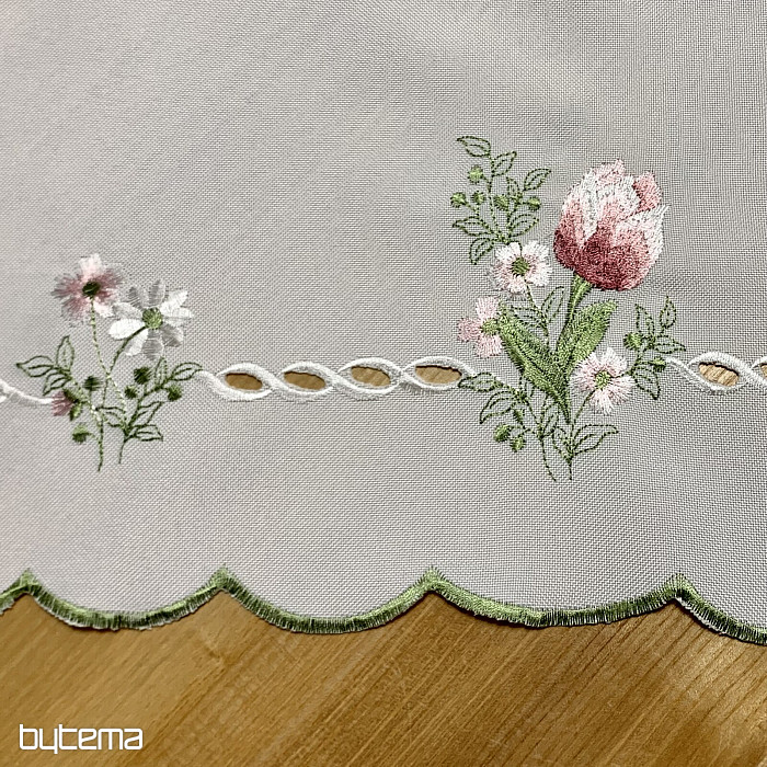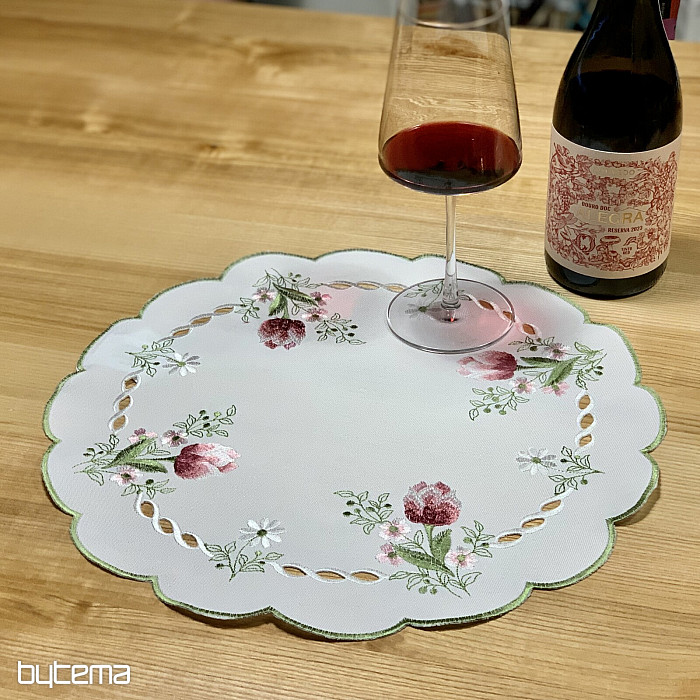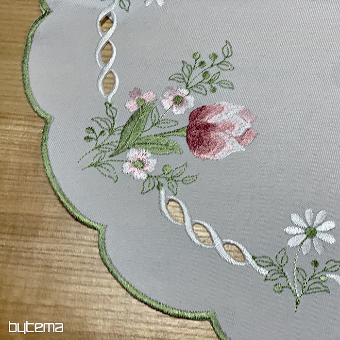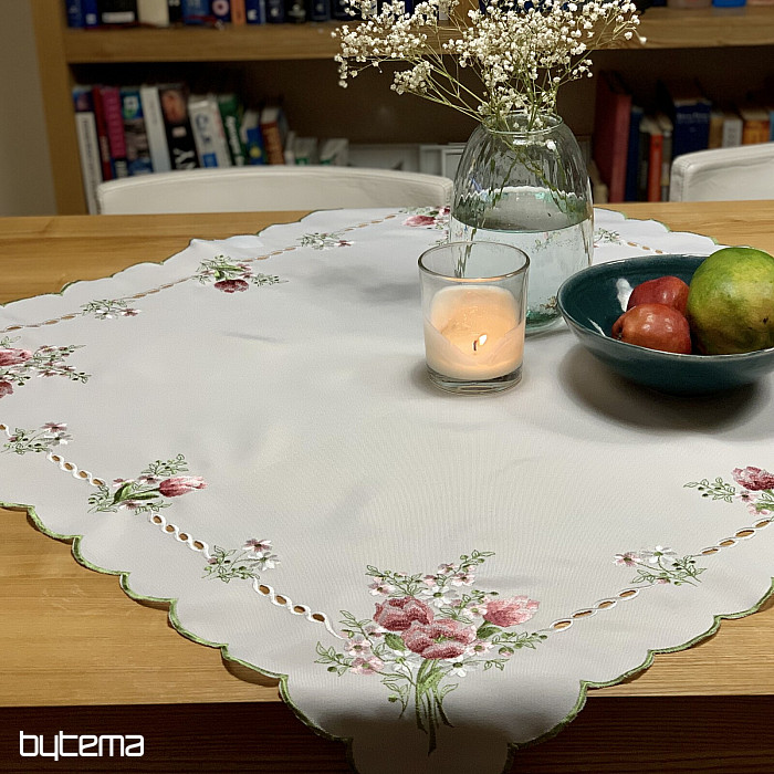Beautiful embroidered tablecloth with a bouquet of pink tulips motif.