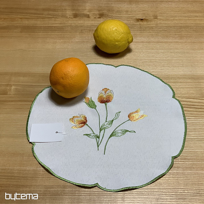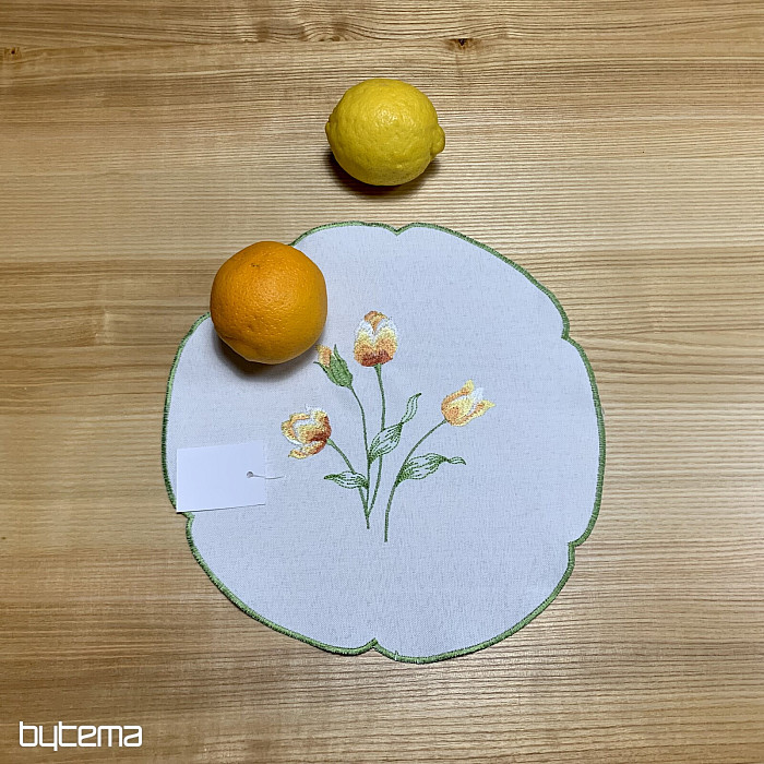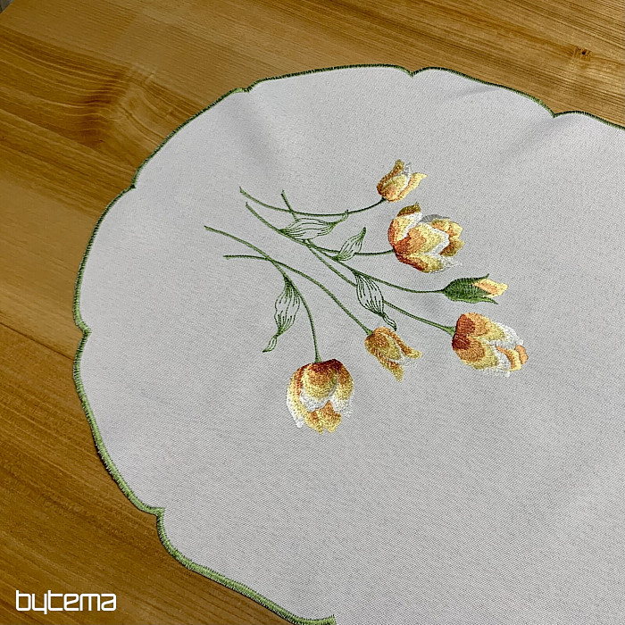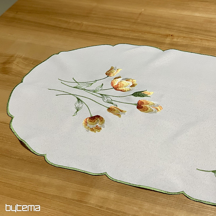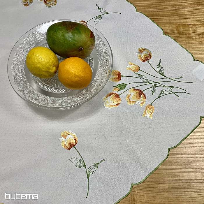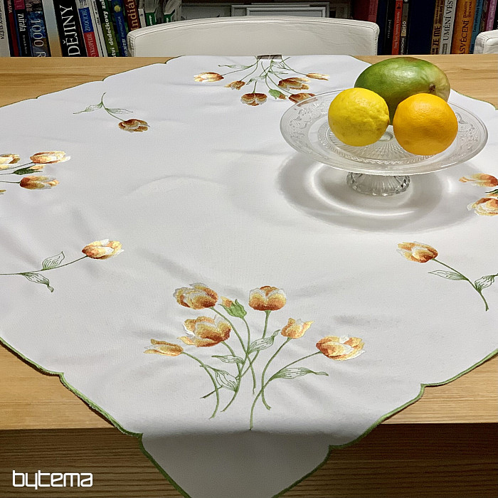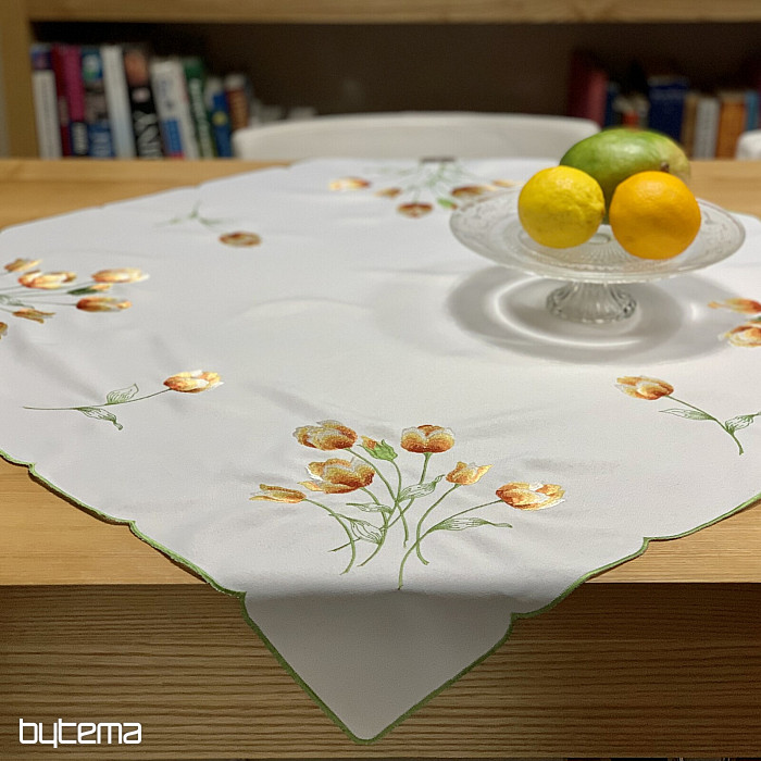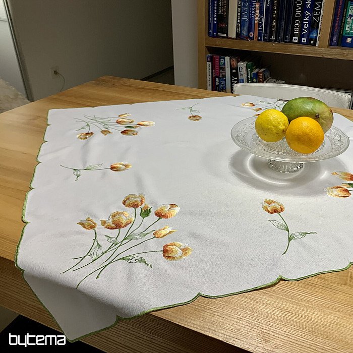 Embroidered tablecloth and scarf with a motif of orange tulips, beautiful embroidery of favorite spring flowers.