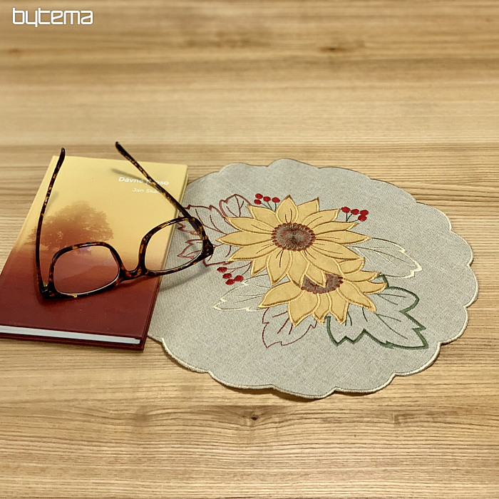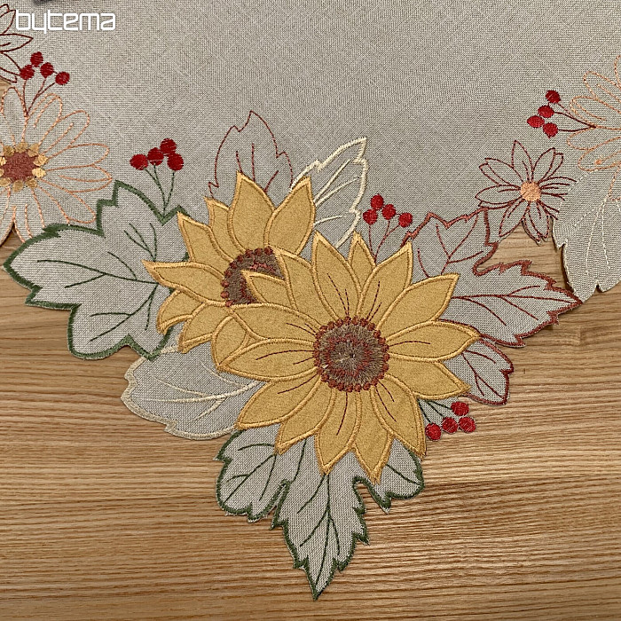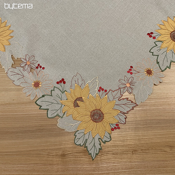 An embroidered tablecloth with sunflowers on a dark beige background will bring a beautiful autumn mood to your home.