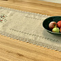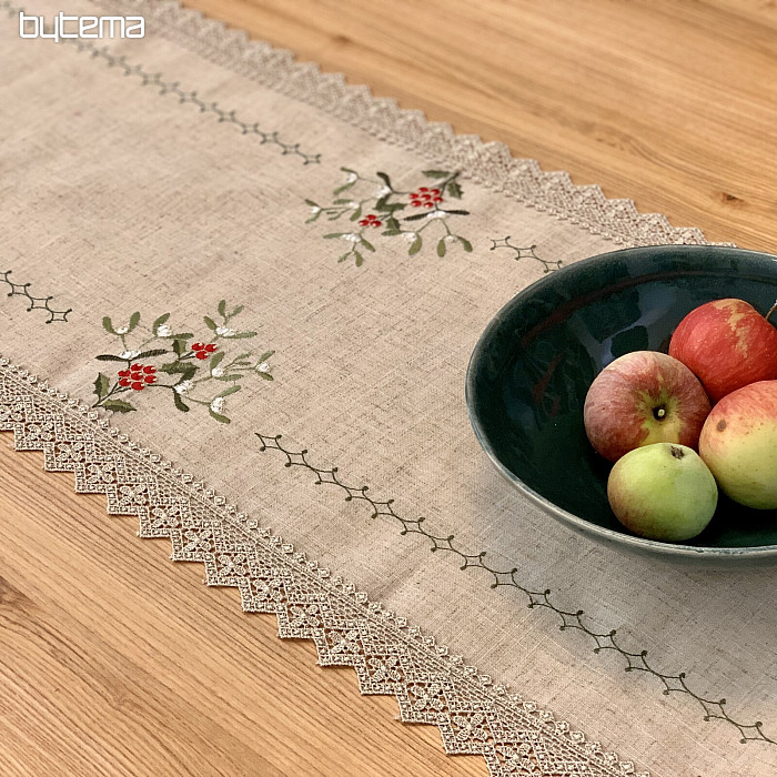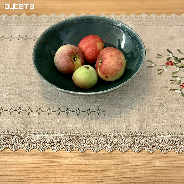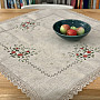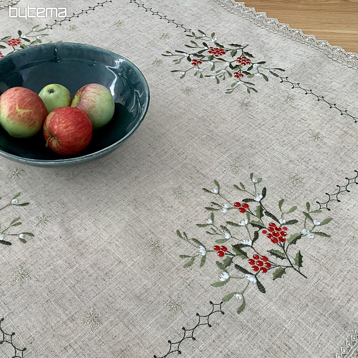 Fine embroidered mistletoe decor. The tablecloth is edged with lace, which gives it its Christmas charm.