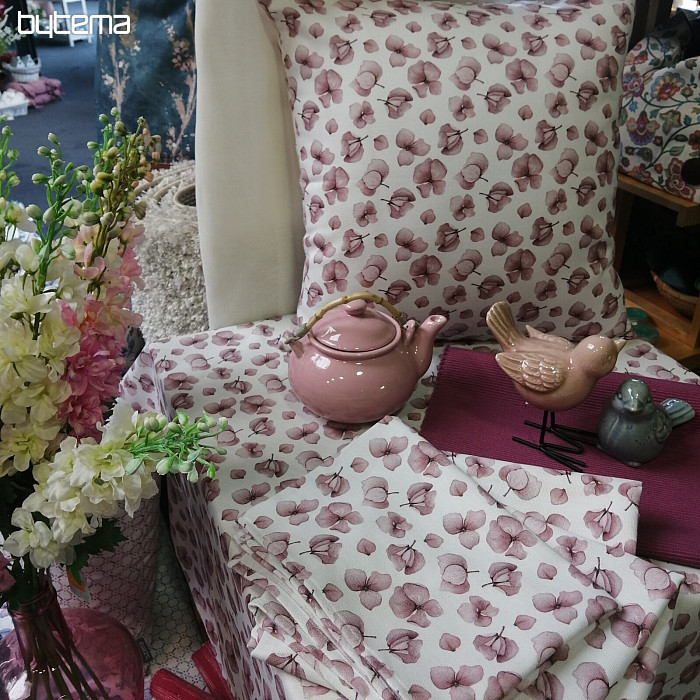 At this time, Hydrangeas are in full bloom in gardens and parks. Their gentle beauty and varied colors are also an inspiration as motifs on fabrics, cushions and tablecloths. We offer many variations of this beautiful motif. Fabrics such as Horteznie blue, Horteznie Leone, Hydrangea and blackberries, Hortezni, Flower Paradise, Horteznie Manuela can pleasantly complement and cosy your home. Cushions and tablecloths made of Montana violet-blue flower and Montana rose-pink flower are complemented with a delicate pattern by tablecloths and scarves made of Montana grid old pink and blue fabric.