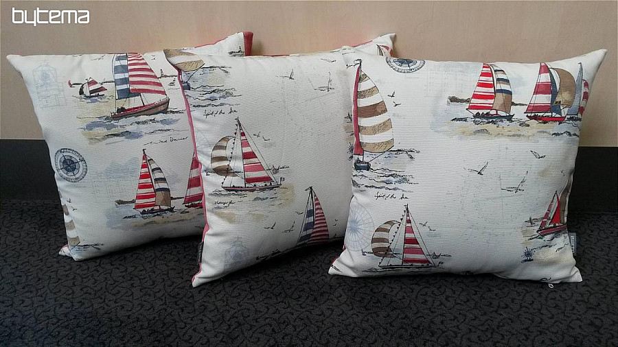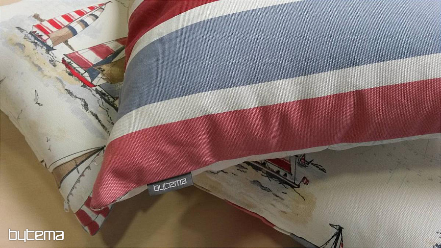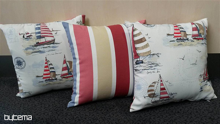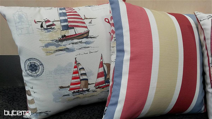 Decorative pillow with sailboat motif, combined with a stripe. Very nice design for lovers of the sea, which will create an atmosphere of calm comfort seaside holiday.