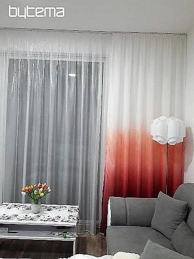 Another of our orders is a beautiful quality curtain from Gerster and a curtain with a very interesting coloring solution. From the darkest bordo color to white creates a modern effect. The curtain and curtain are also sewn with a shirring ribbon for Gerster, which creates a regular shirring effect. On the back of the ribbons are pockets, behind which are attached hooks, which are placed in the rail of the ceiling curtain. They allow simple handling of the curtain