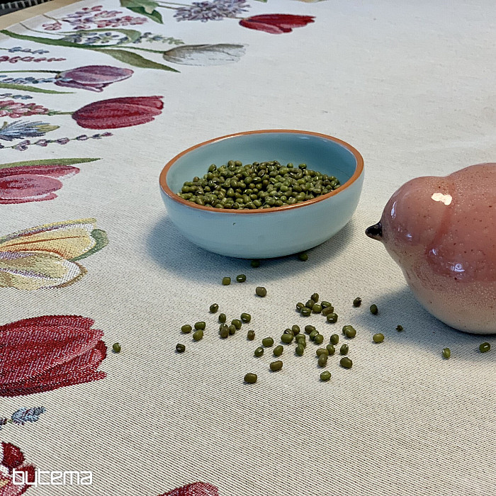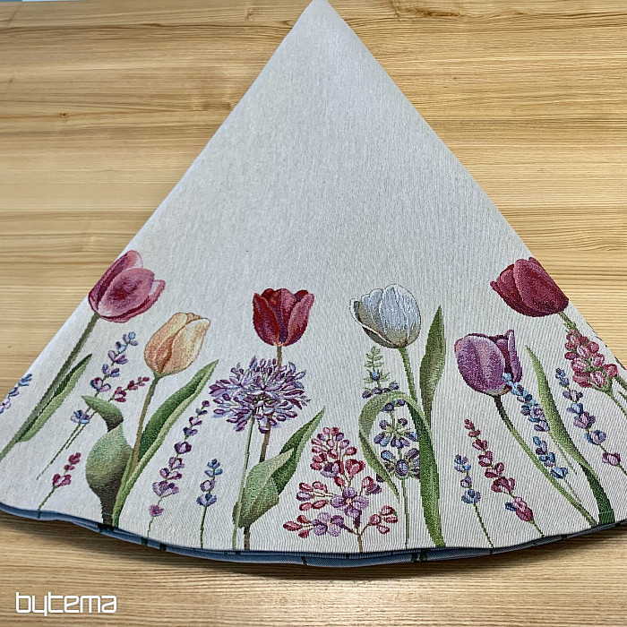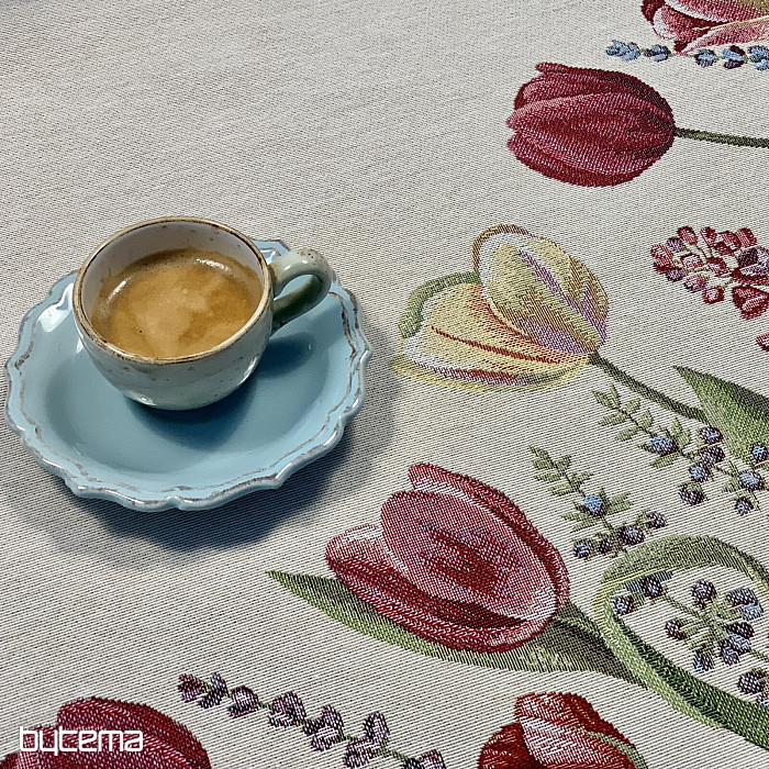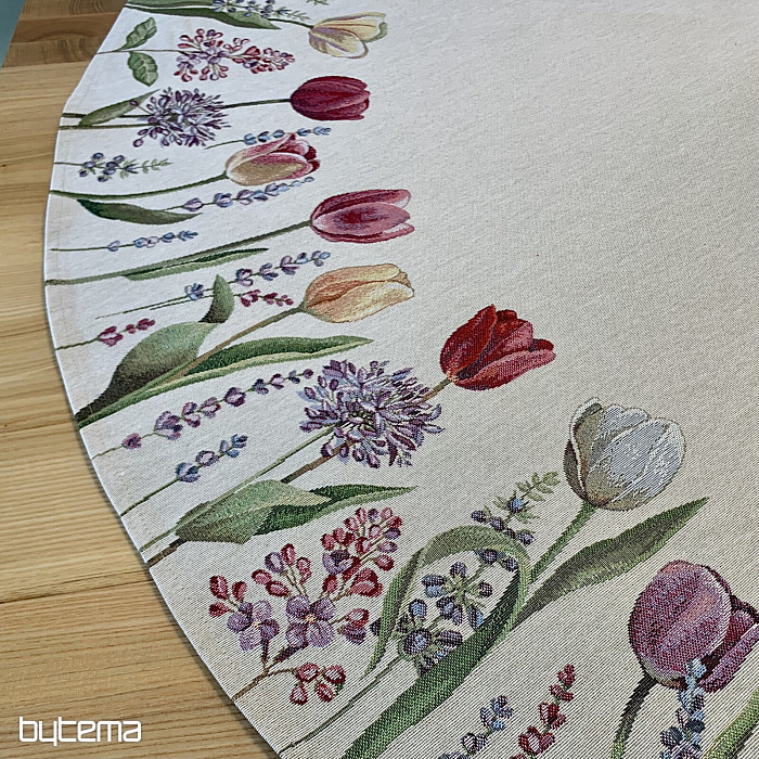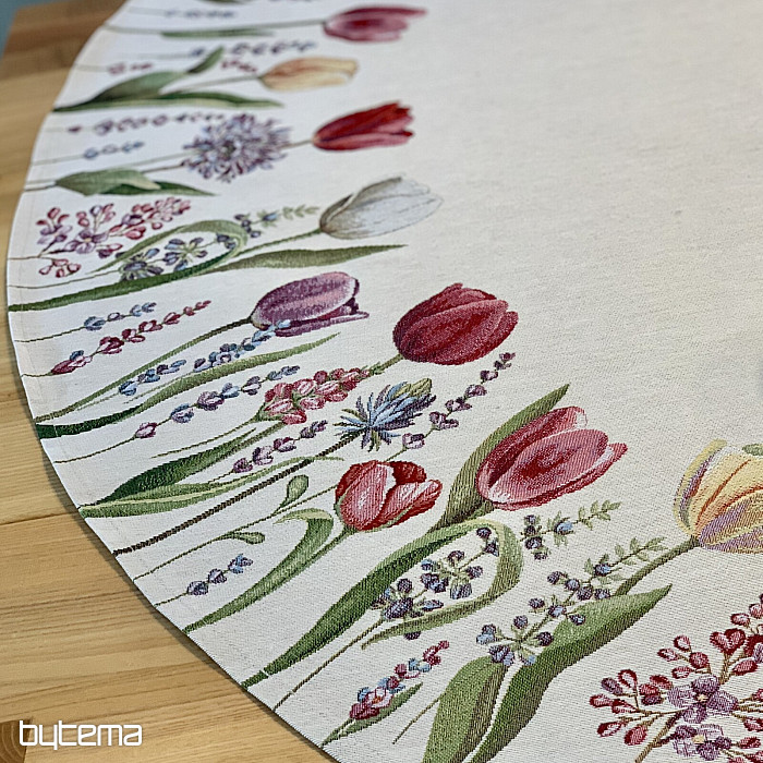 The spring tulip motif on this tapestry tablecloth is magical. Your dining room will be in full bloom.
