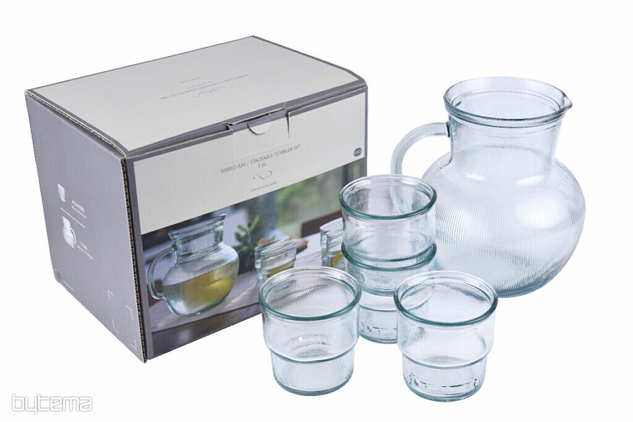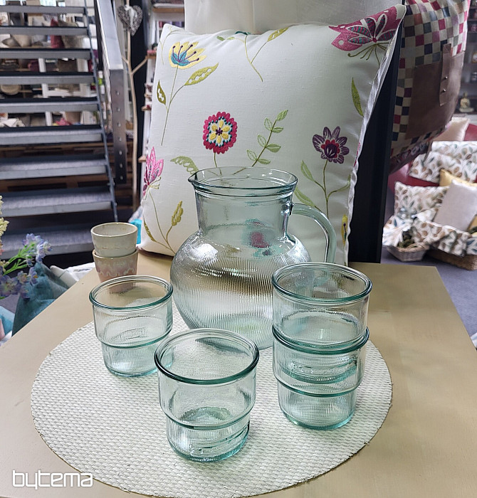 A beautiful jug and 4 glasses in a gift box made of 100% recycled glass. The glass is clear, transparent. Made with the environment and the style of your home in mind.
