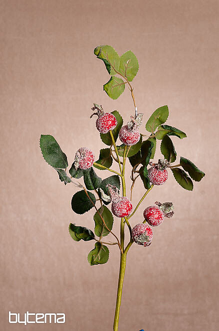 Decoration for the winter season. There are seven large rose hips and many leaves on a 46 cm long twig. The twig is covered in snow and looks nice.