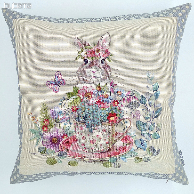 Soft, romantic decorative pillow with spring flowers in a teacup.