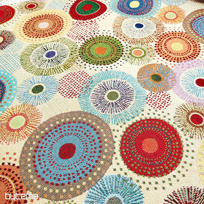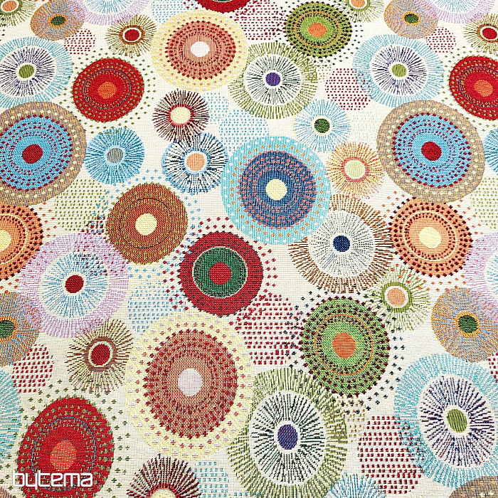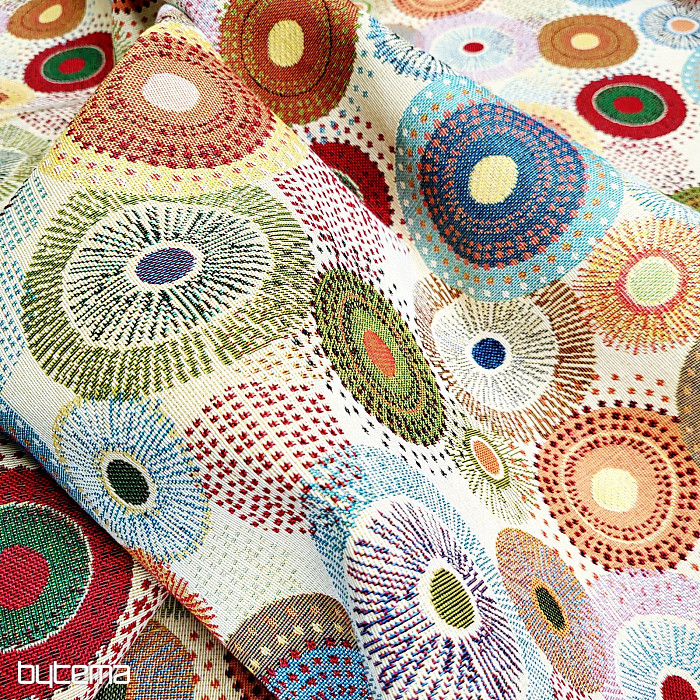 Tapestry fabric with colorful mandala wheels is our new addition to the store. The subtle but vibrant colors add elegance to the fabric.