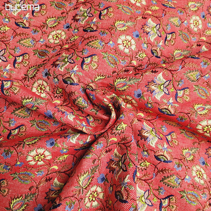 Tapestry fabric full of delicate blooming flowers on a red background. The fabric fits beautifully into the castle style. The fabric is delicately green on the other side and therefore can be used as a double-sided fabric.