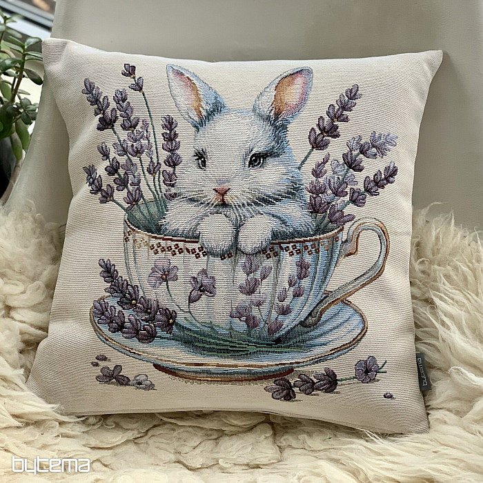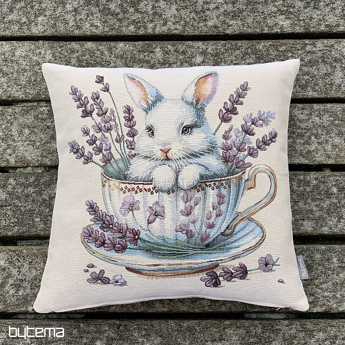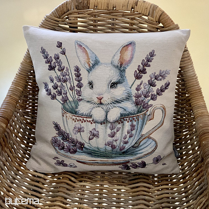 Tapestry pillowcase with a cute bunny in a porcelain service with fragrant lavender around. A beautiful and delicate decoration not only for Easter time.