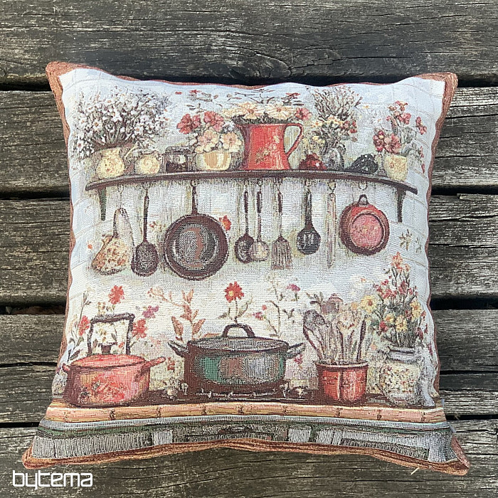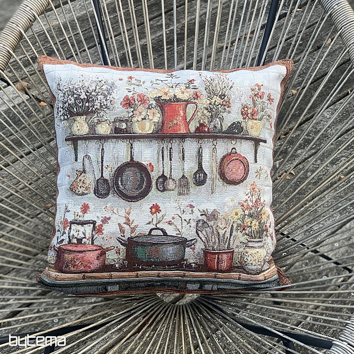 A tapestry cover with a vintage kitchen motif is just the thing for your kitchen.