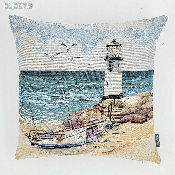 A tapestry cover with a nautical motif, where a lighthouse definitely belongs at low tide. A beautiful combination of covers and fabrics with a sea breeze.