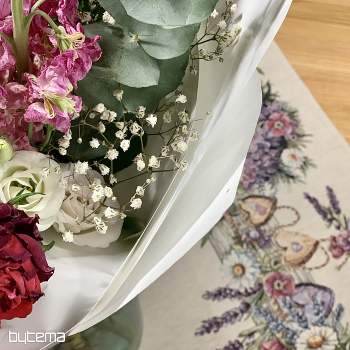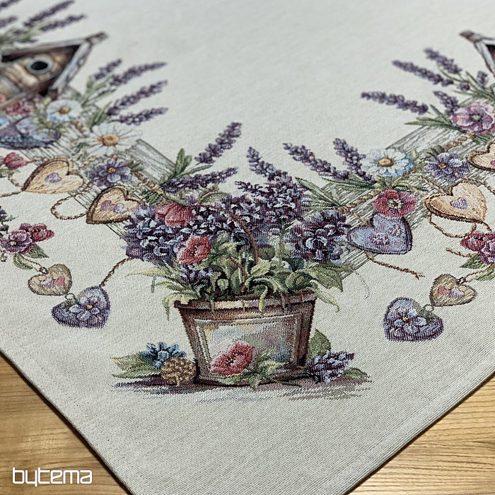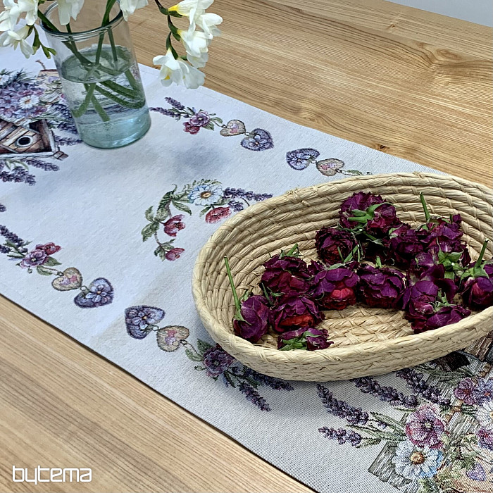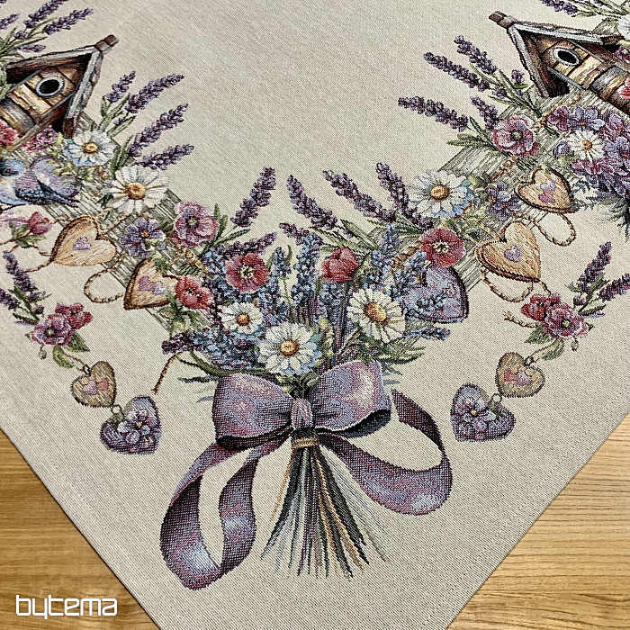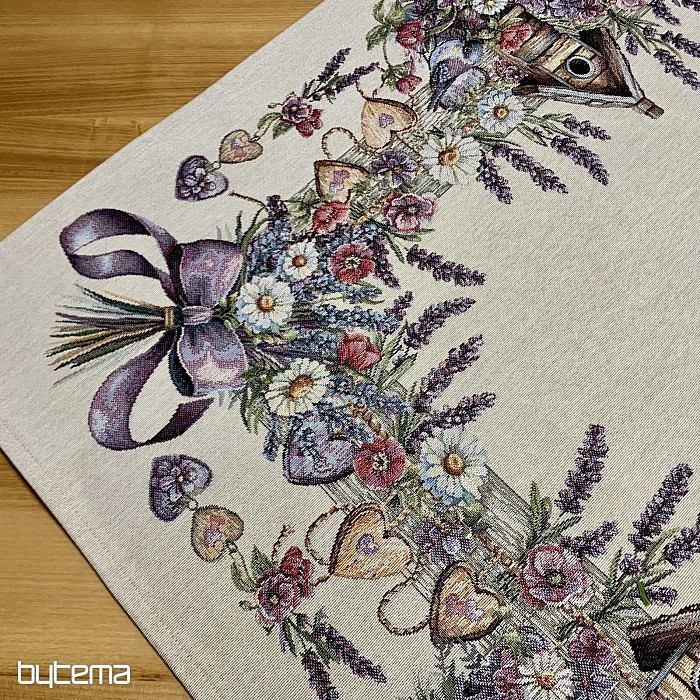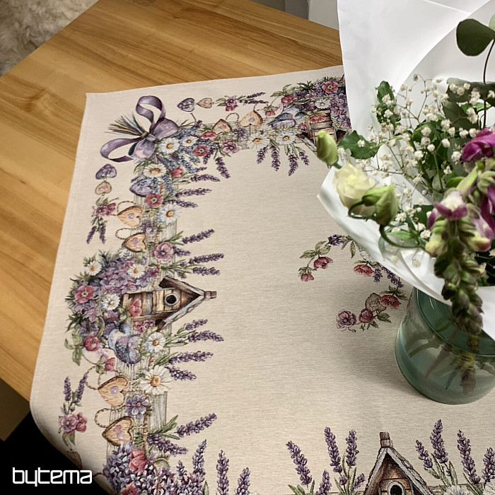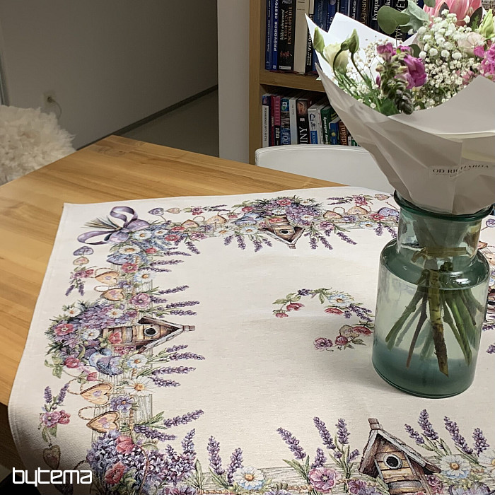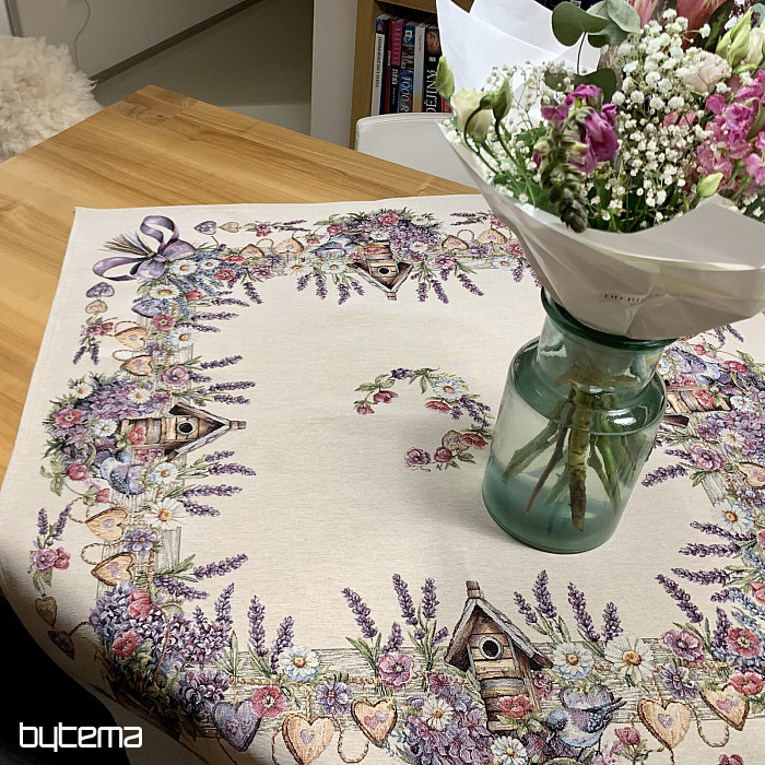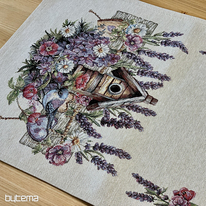 Tapestry tablecloth or scarf with a birdhouse, a bird and delicate lavender. A beautiful and delicate design that will delight you all year round.