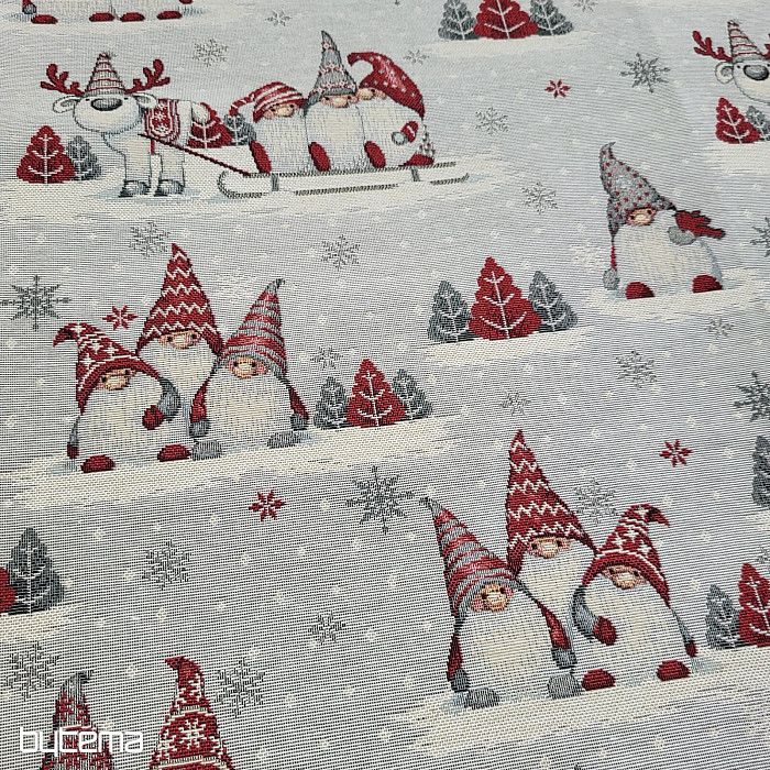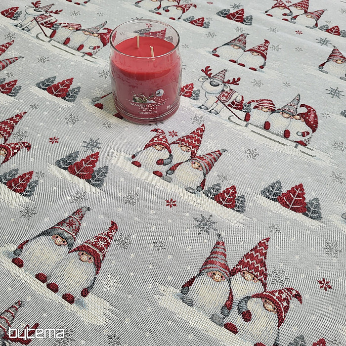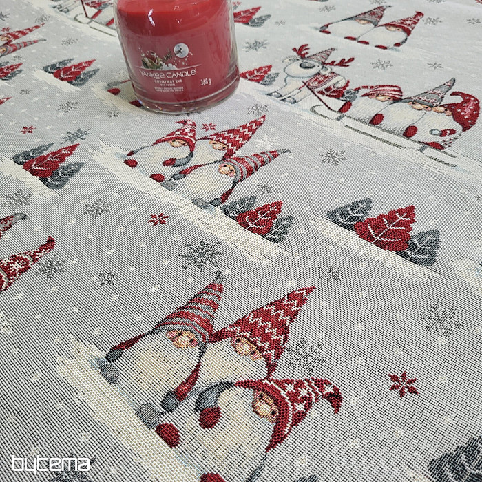 A tapestry tablecloth with a cute motif of Christmas elves will decorate your Christmas table.