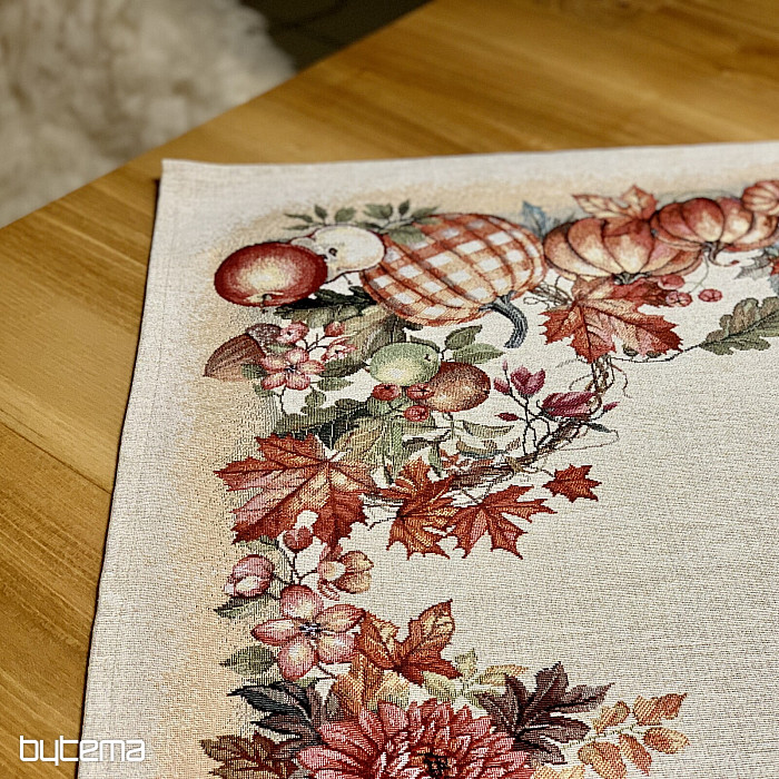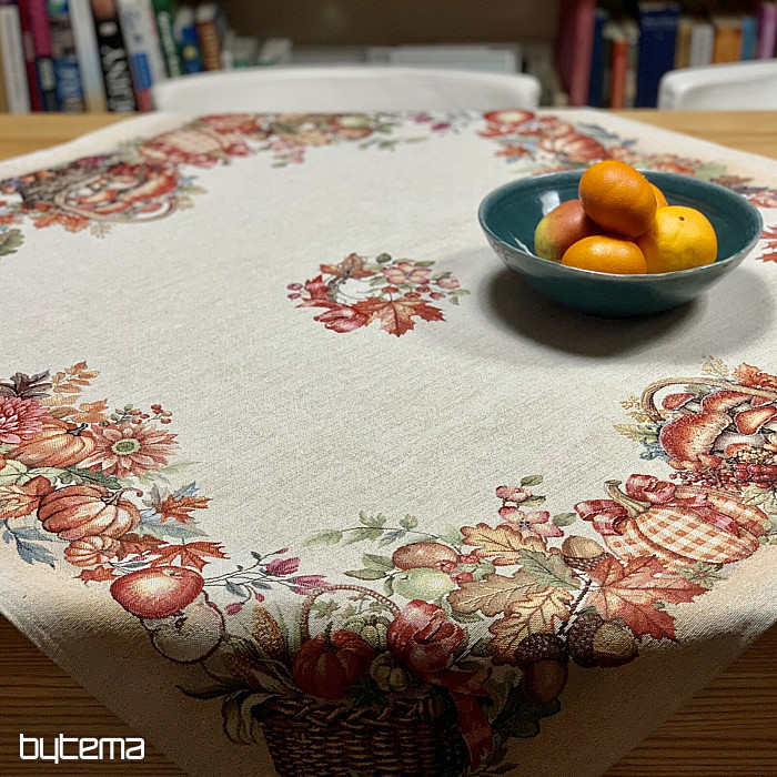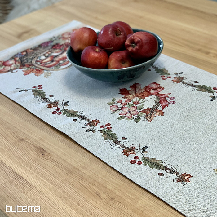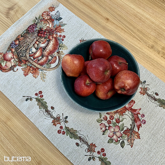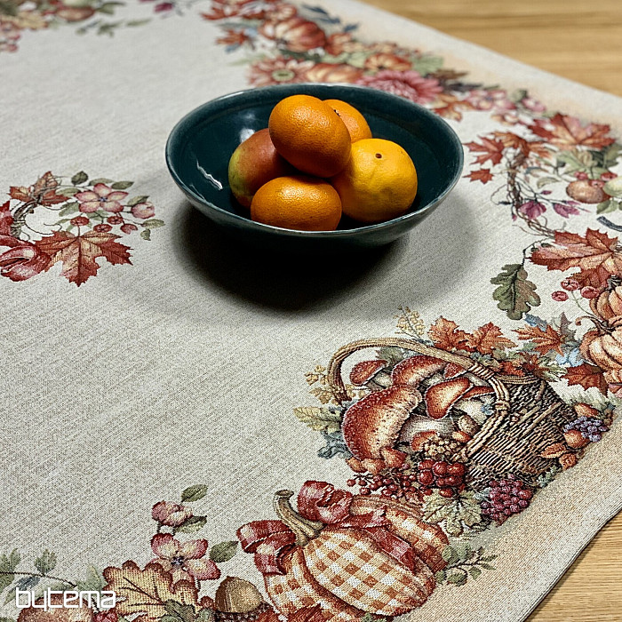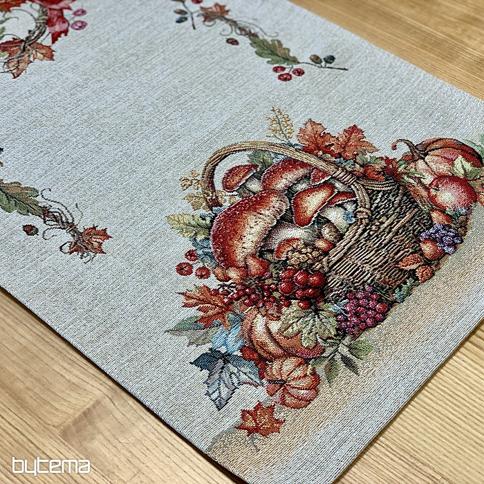 A tapestry tablecloth and scarf with a motif of fruits and mushrooms will create a pleasant atmosphere.