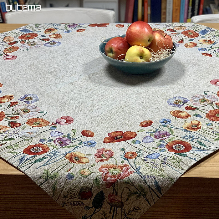 Gobelin tablecloth and scarves with poppy flowers go beautifully with the country style. You can also add a pillowcase to the combination.