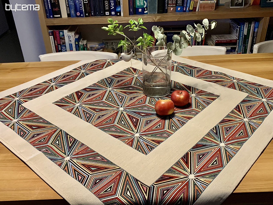 Tapestry tablecloths and scarves in ento style.