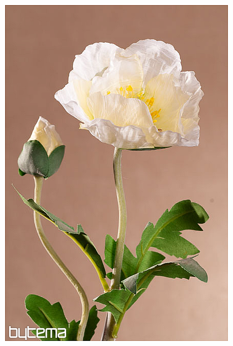 A poppy with a white flower and one bud. There are several leaves on a 69 cm long stem. The flower is easily mistaken for the real one that grows in meadows and fields due to its processing.